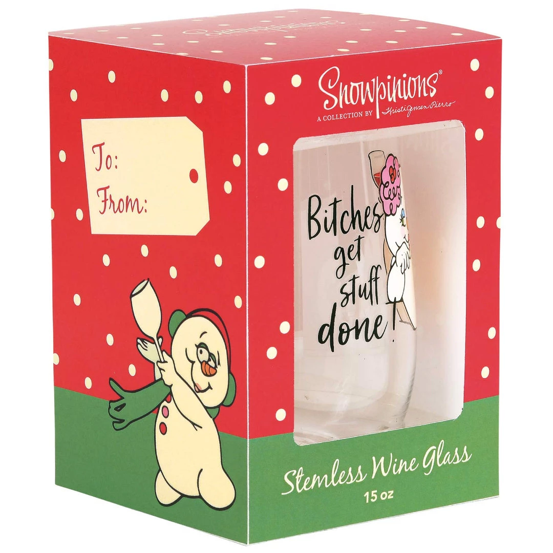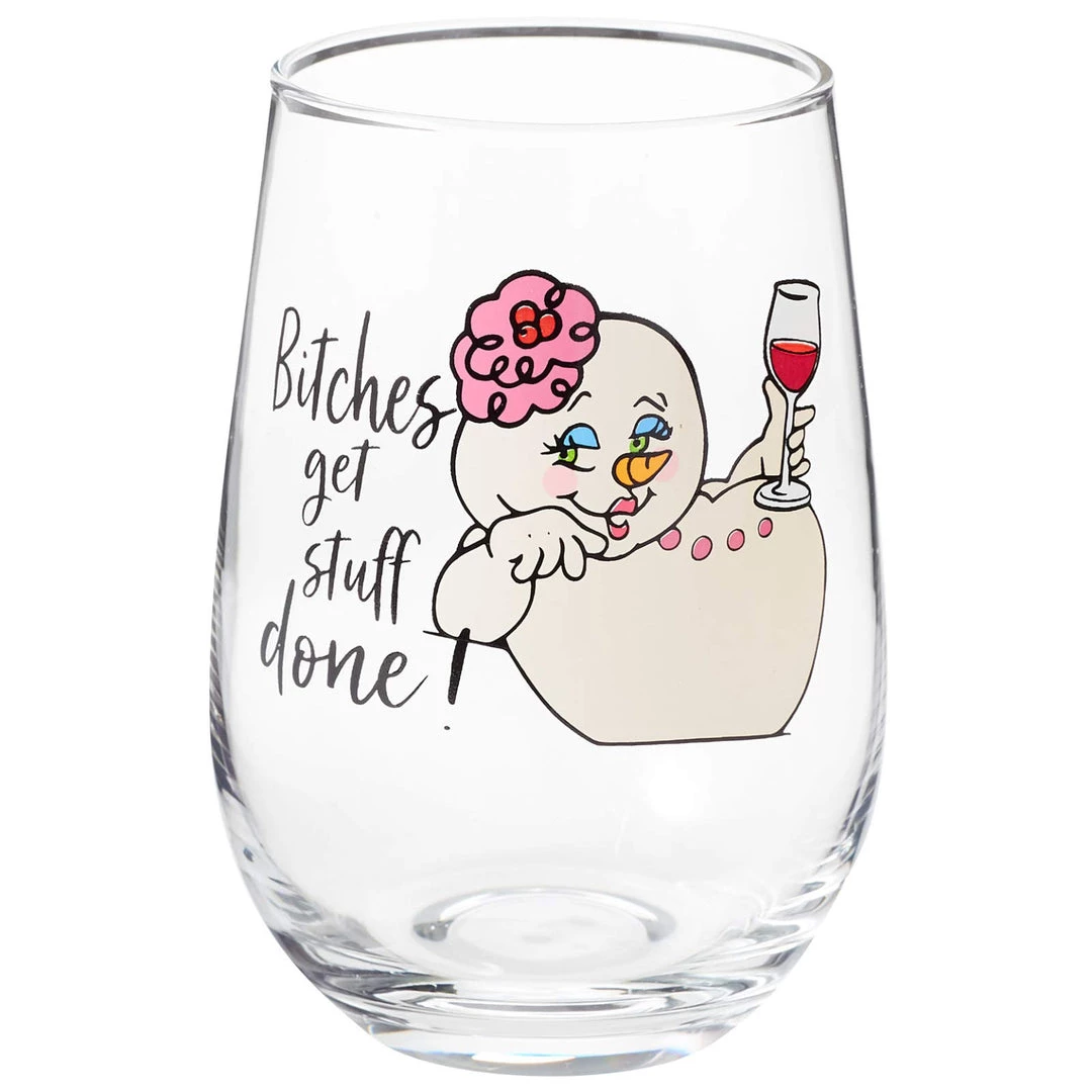 Decorated with a fashionable Snowman, this wine glass celebrates the bitches