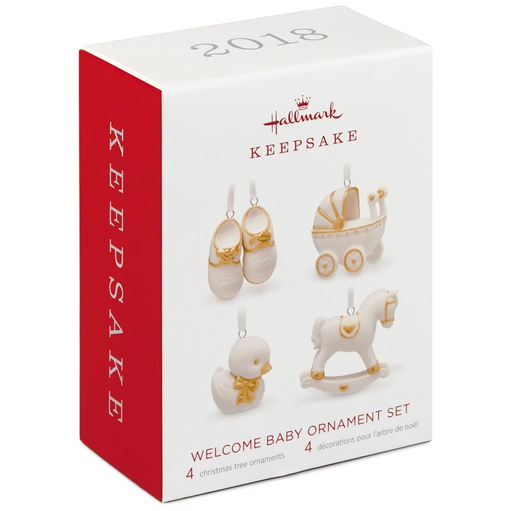 This sweet assortment of four miniature Christmas tree ornaments features all the precious novelties of infancy, so you don’t have to pick just one. Accented with painted gold detailing, the white porcelain miniature ornament designs include a duck, buggy, rocking horse and baby booties. Perfect for celebrating baby’s first Christmas or as a baby shower gift.