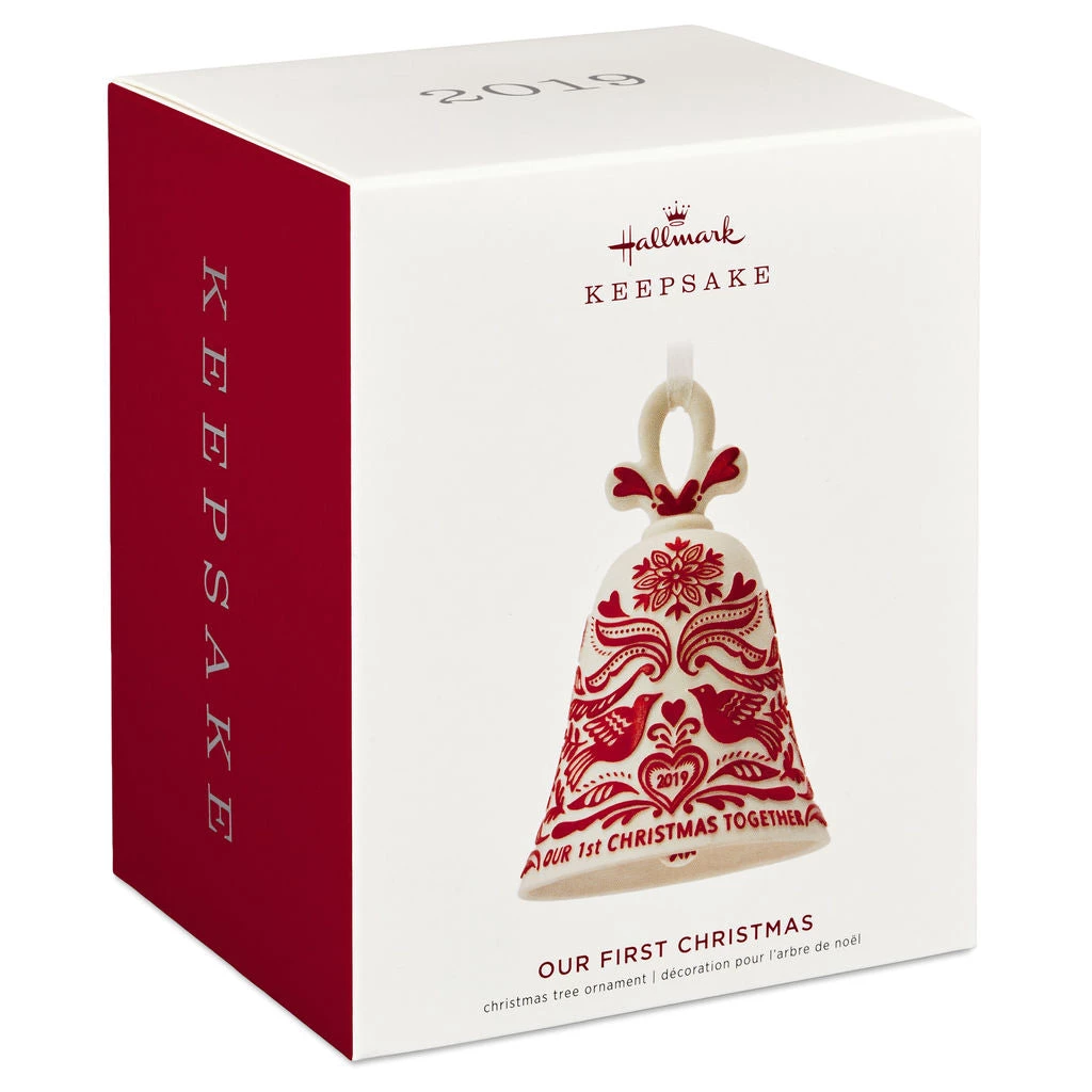 Give them a gift they’ll cherish for years to come. This festive porcelain bell Christmas tree ornament features an elegant scrollwork design with lovebirds, hearts and snowflakes. Year dated 2019, it’s a lovely keepsake for newlyweds or any new couple.