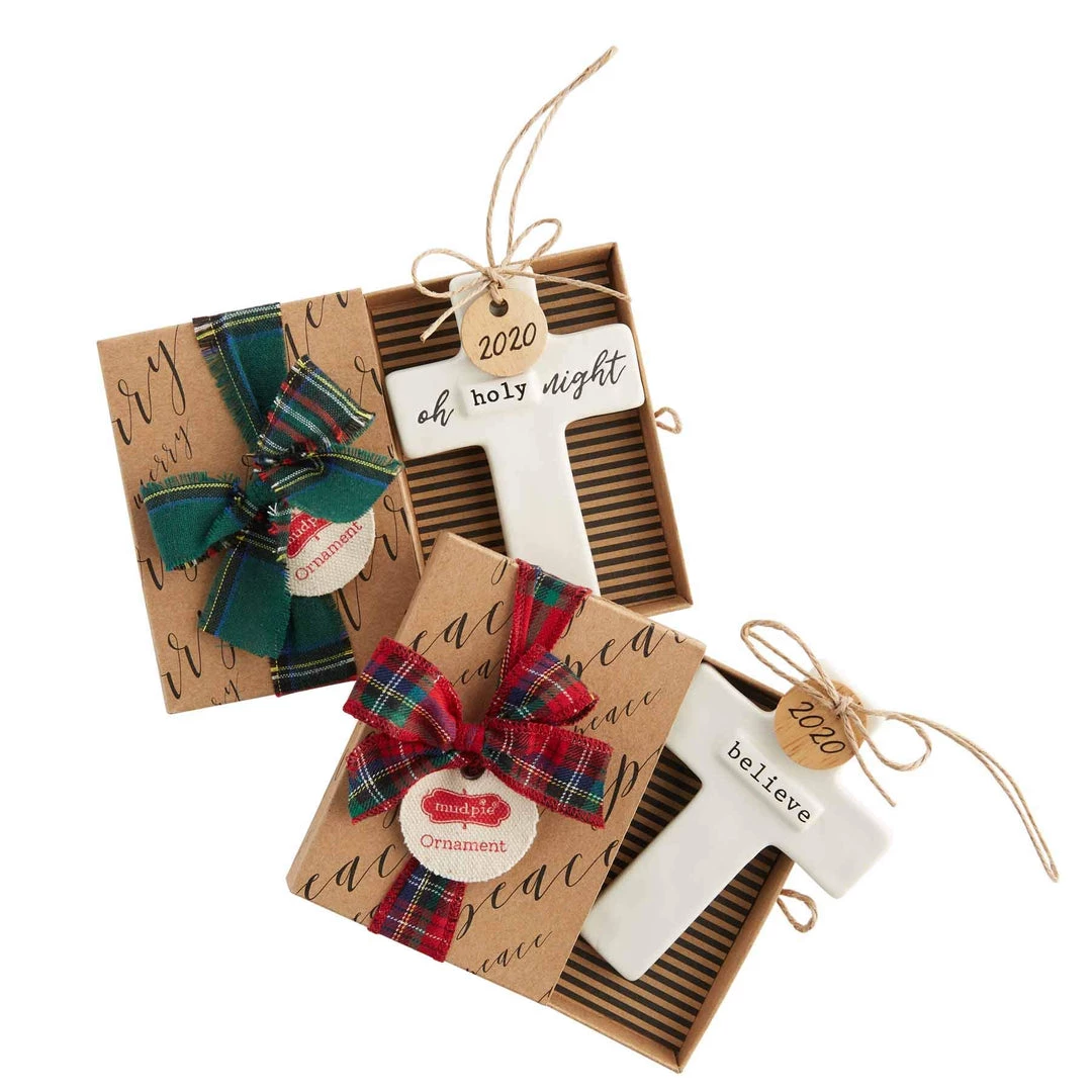 Color:Holy Ceramic cross ornament with debossed sentiment and printed wood