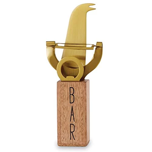 - 4-piece set. Mango wood storage block features printed sentiment and holds brass plated stainless steel bar knife, veggie/fruit peeler and bottle opener.