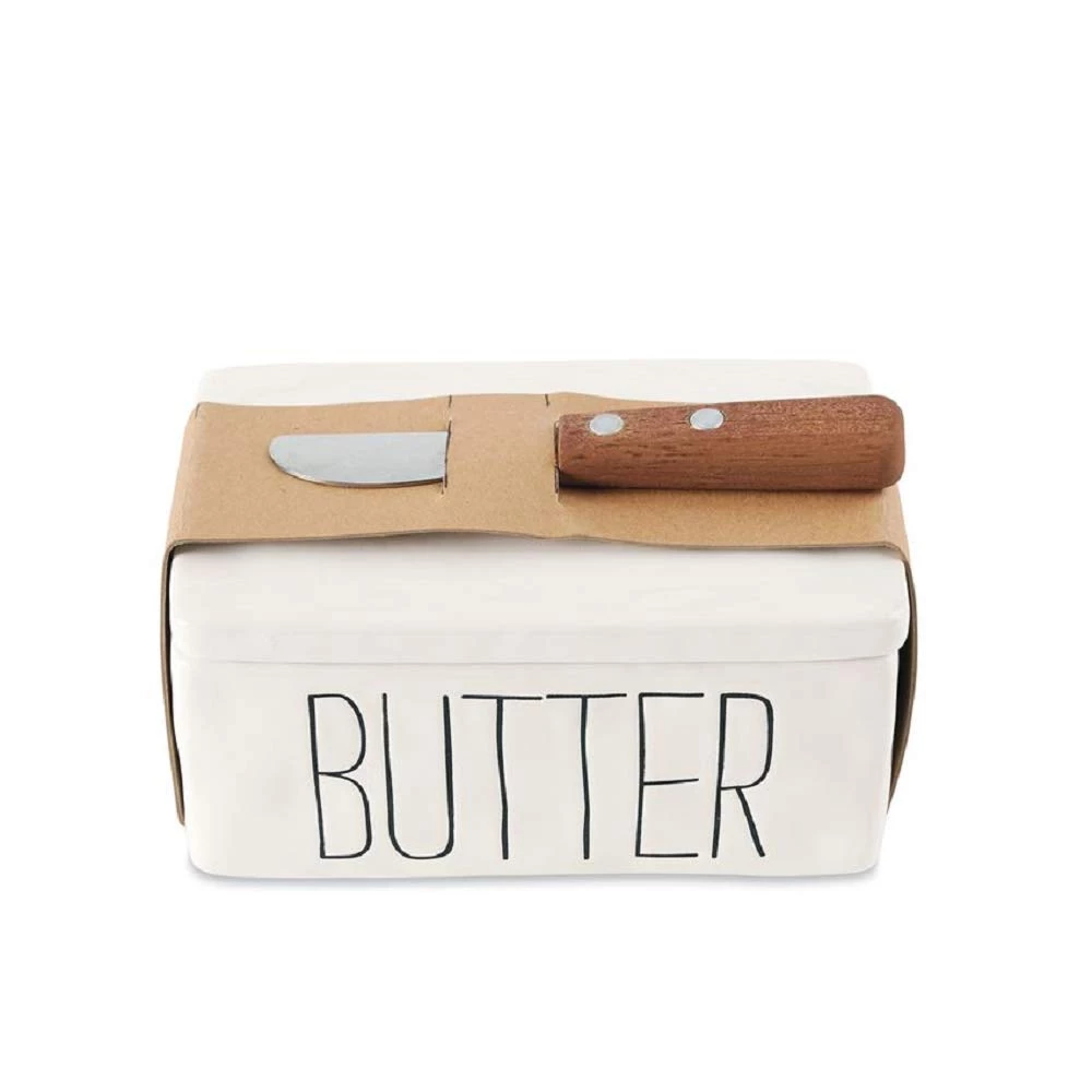 3-piece set. Ceramic butter dish features debossed sentiment exterior, removable lid and arrives with stainless steel spreader with wooden handle.