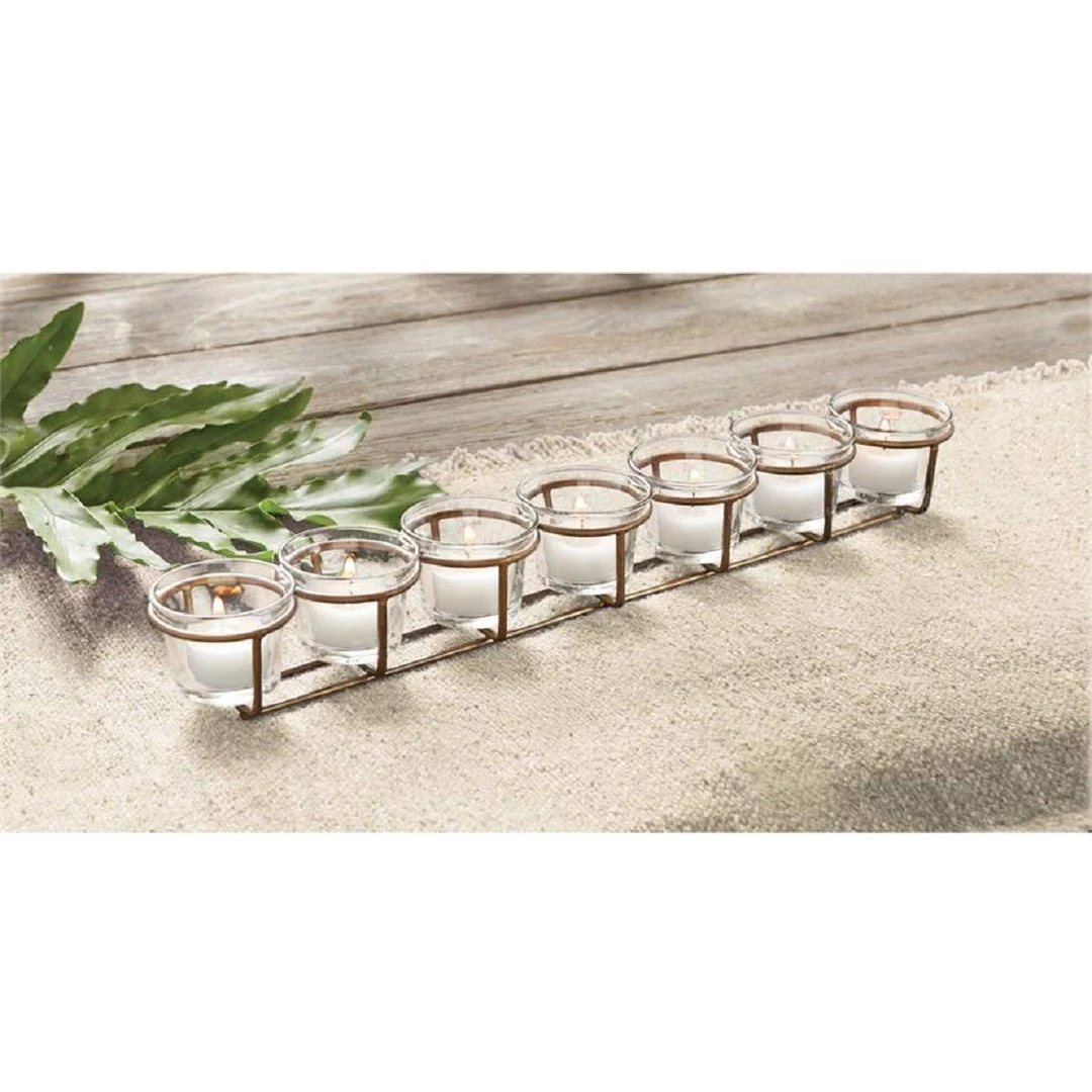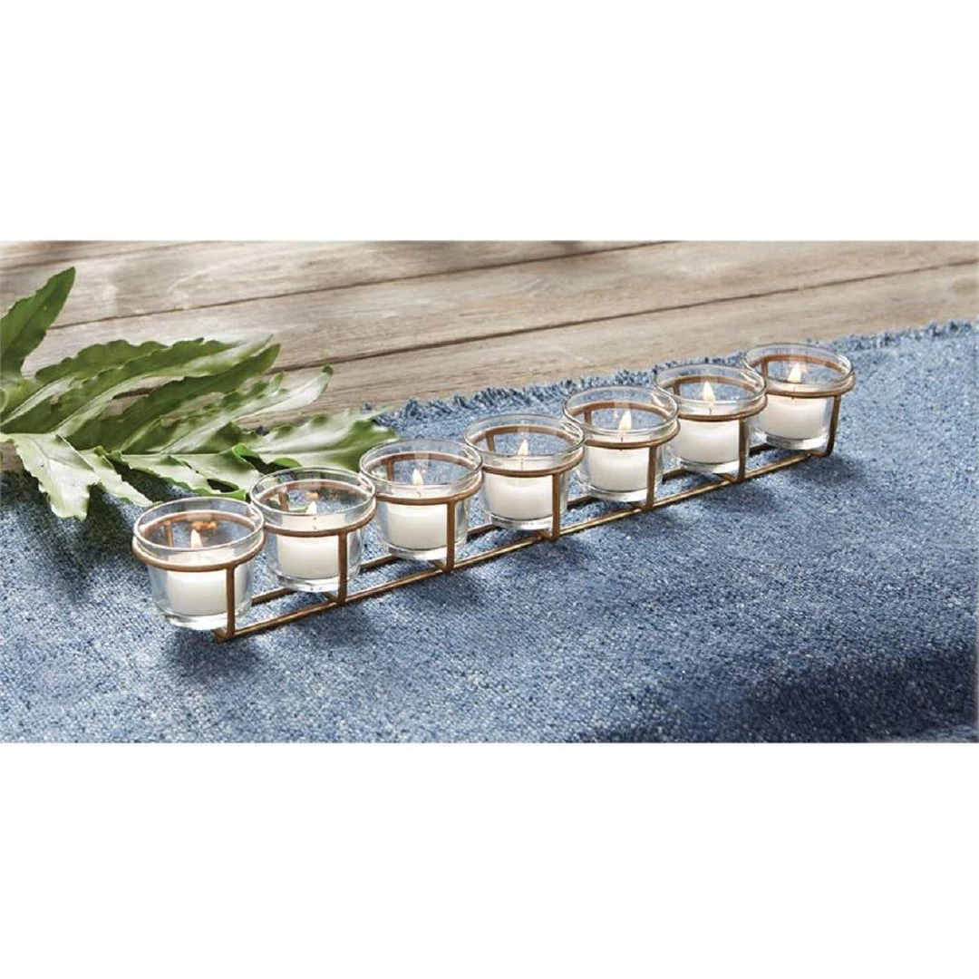 - Charmingly Simple votive holder features two brass rods as the base and 7 round brass holders to hold the 2″ Tall glass votives.