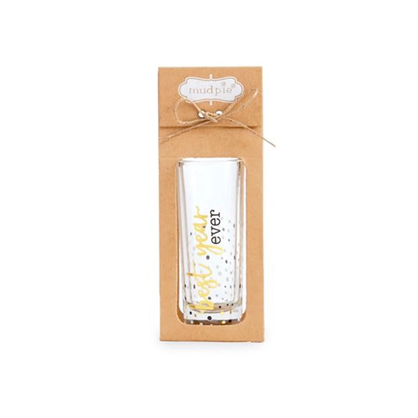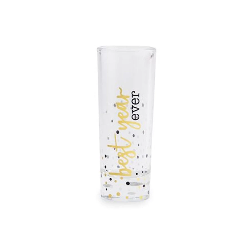 Printed shot glass features New Year themed sentiment with gold foil detail and confettiaccent dots.