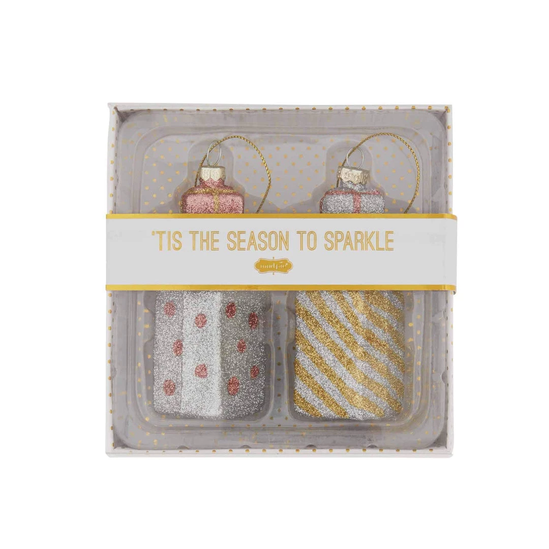 Color:Gifts Set of glass Christmas ornaments feature glitter wash exteriors.