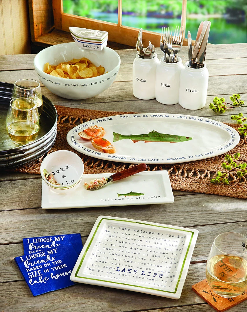 Ceramic utensil holder features three joined preserve-style jars to hold “SPOONS, ” “FORKS” and “KNIVES. “
