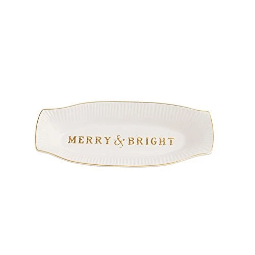 Stoneware oblong serving dishes feature fluted edge detail, gold foil rim and embossed “MERRY & BRIGHT” or “holiday cheer” sentiment.