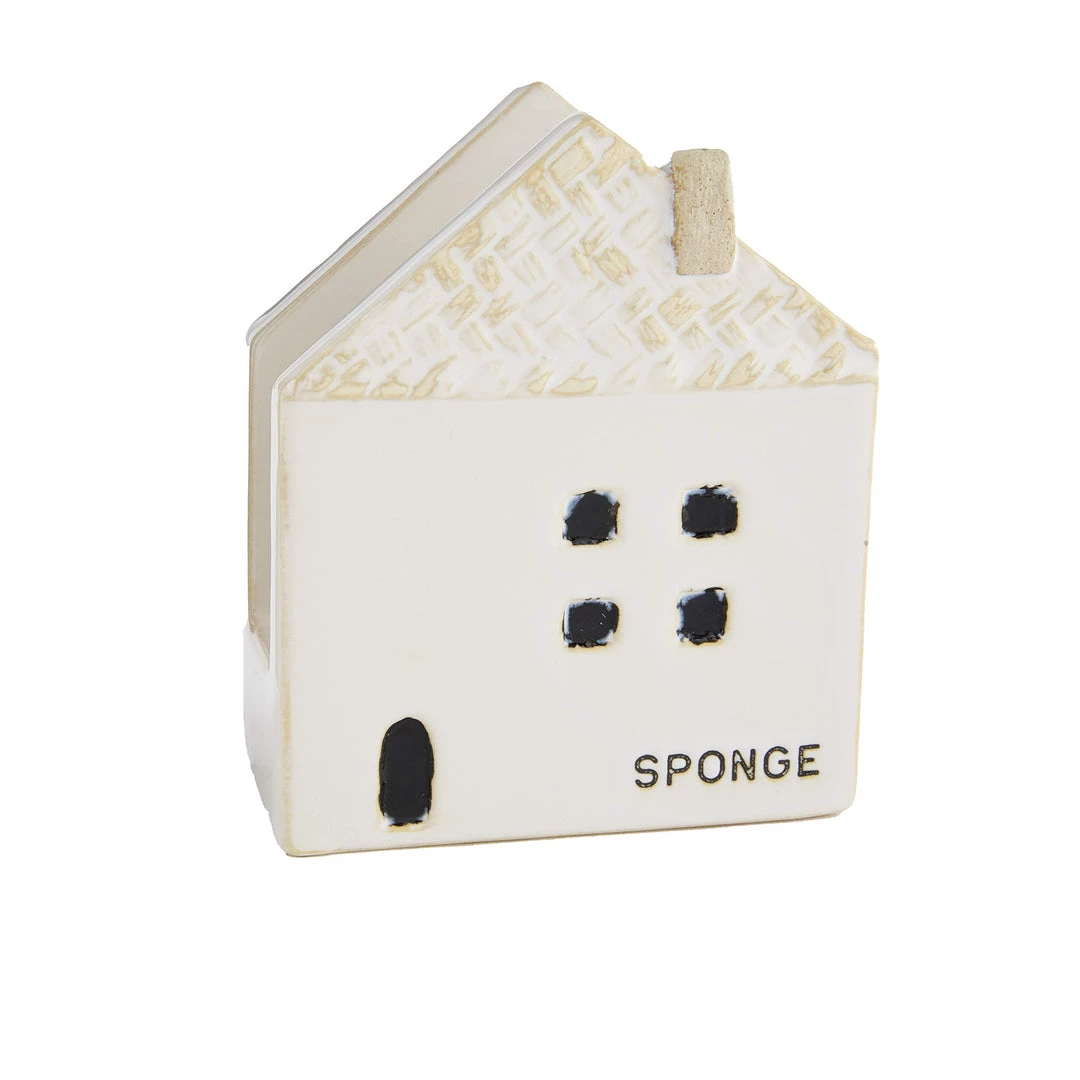 - Our house shaped sponge holder is a kitchen must have. The stoneware home shaped sponge holder features the printed sentiment – “Sponge”. The sponge features house details like windows, doors and a roof. This sponge holder is not intended for food use, and should only be used as decorative purposes.
