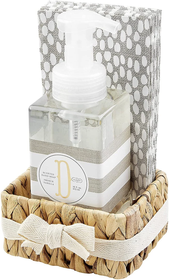 - 3-piece set. Vanilla scented liquid hand soap comes in hyacinth basket with pack of 12 foil initial paper hand towels.