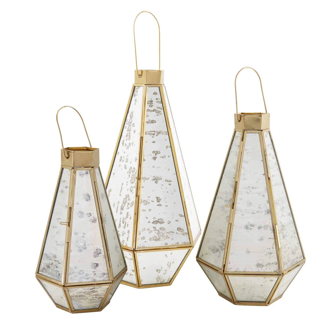 - Brass plated metal lantern features mercury glass panels. Candles not included