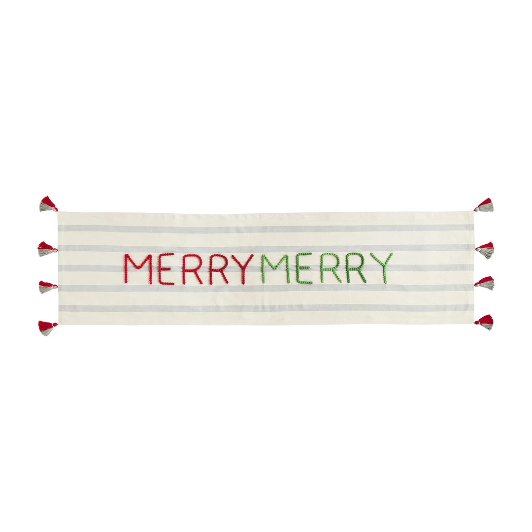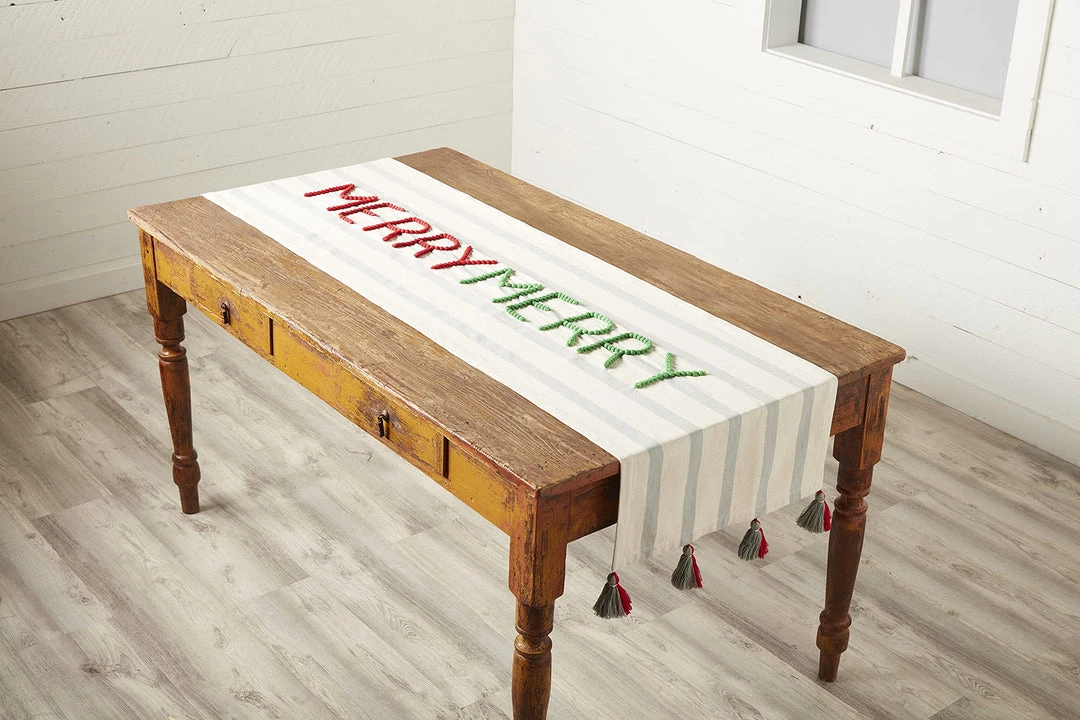 - Woven cotton table runner with chunky embroidery stitching and corner tassels.