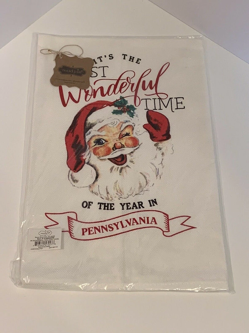 Absorbent cotton hand towel features printed holiday artwork with state specific sentiment.