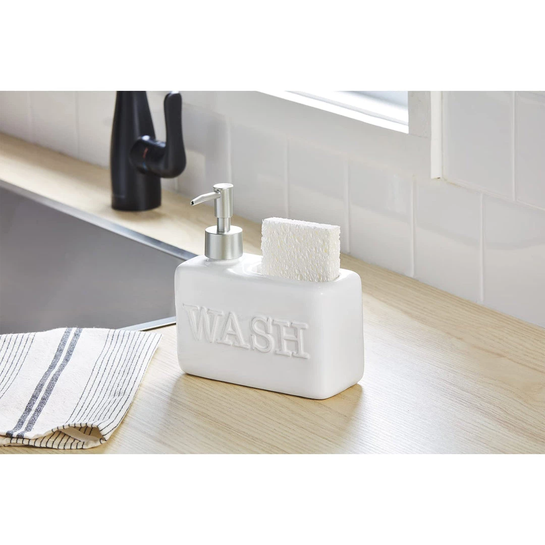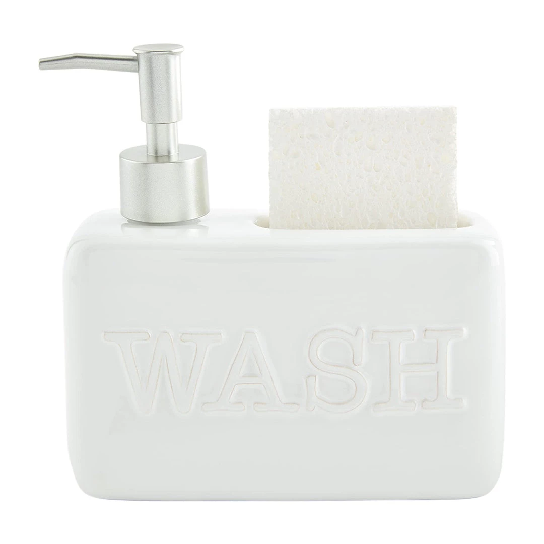- 2-piece set. Ceramic soap pump with attached sponge caddy. Comes with foam sponge.