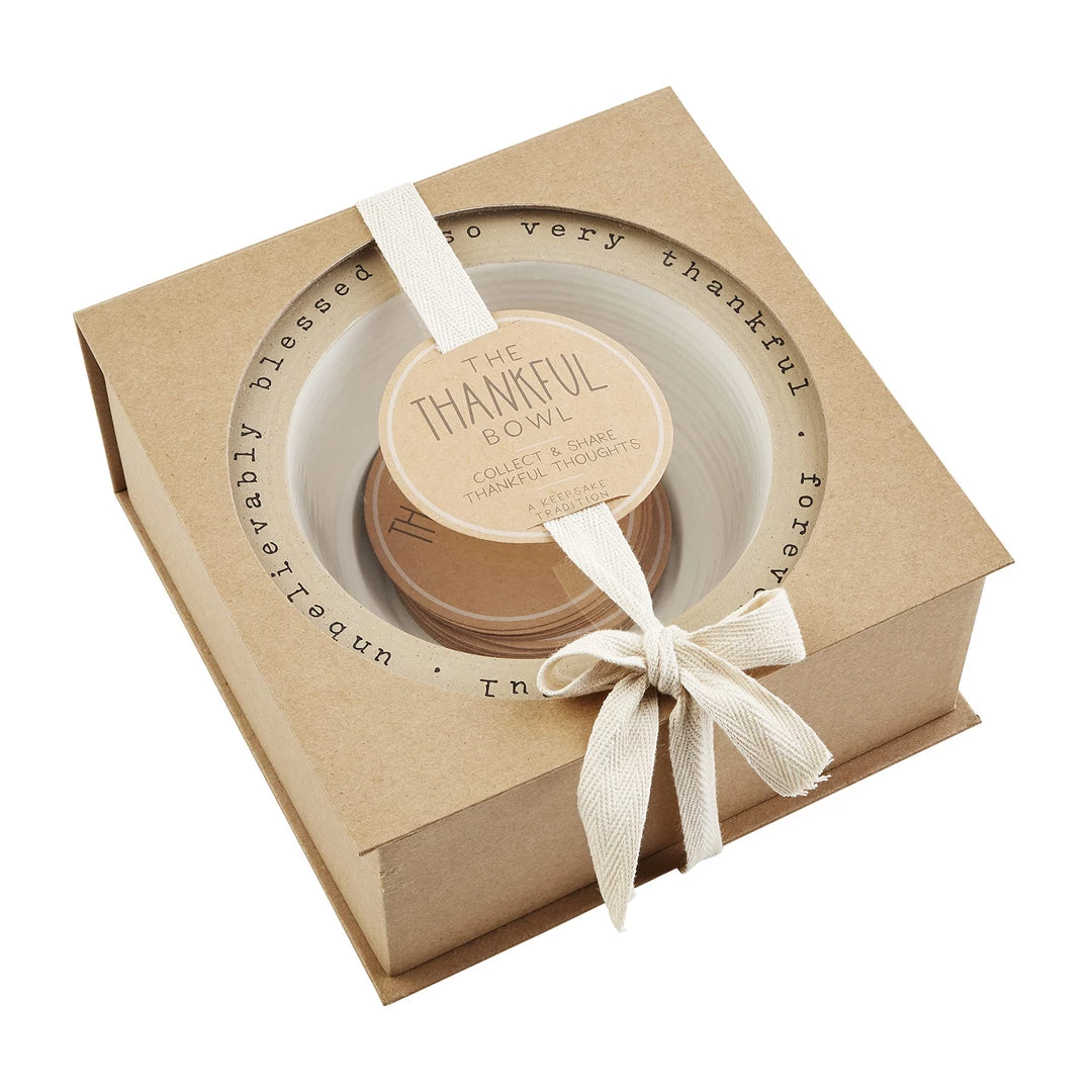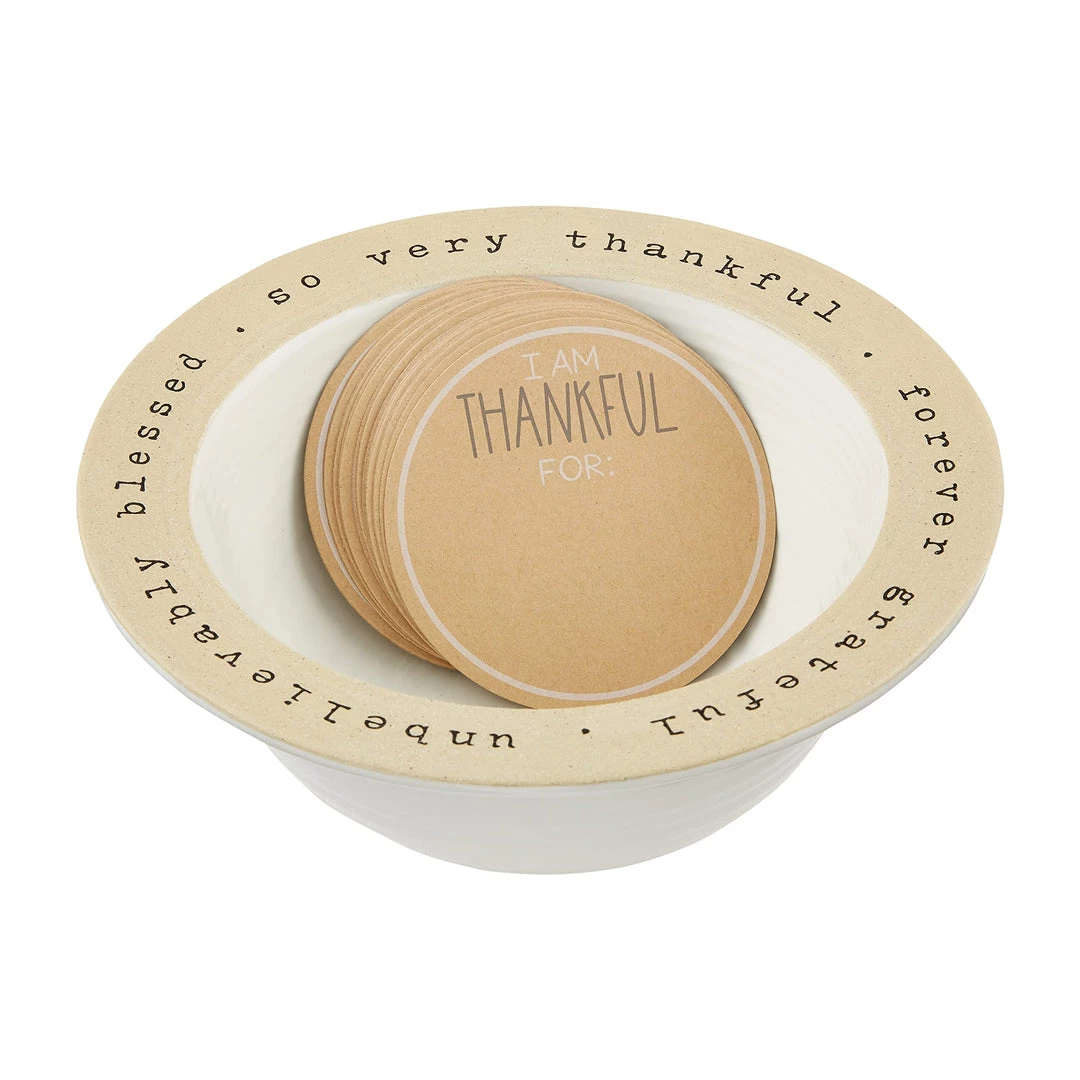 - 2-piece set. Stoneware bowl with sandy rim. Comes boxed with 25 kraft cards. Collect and share thankful thoughts over Thanksgiving dinner.