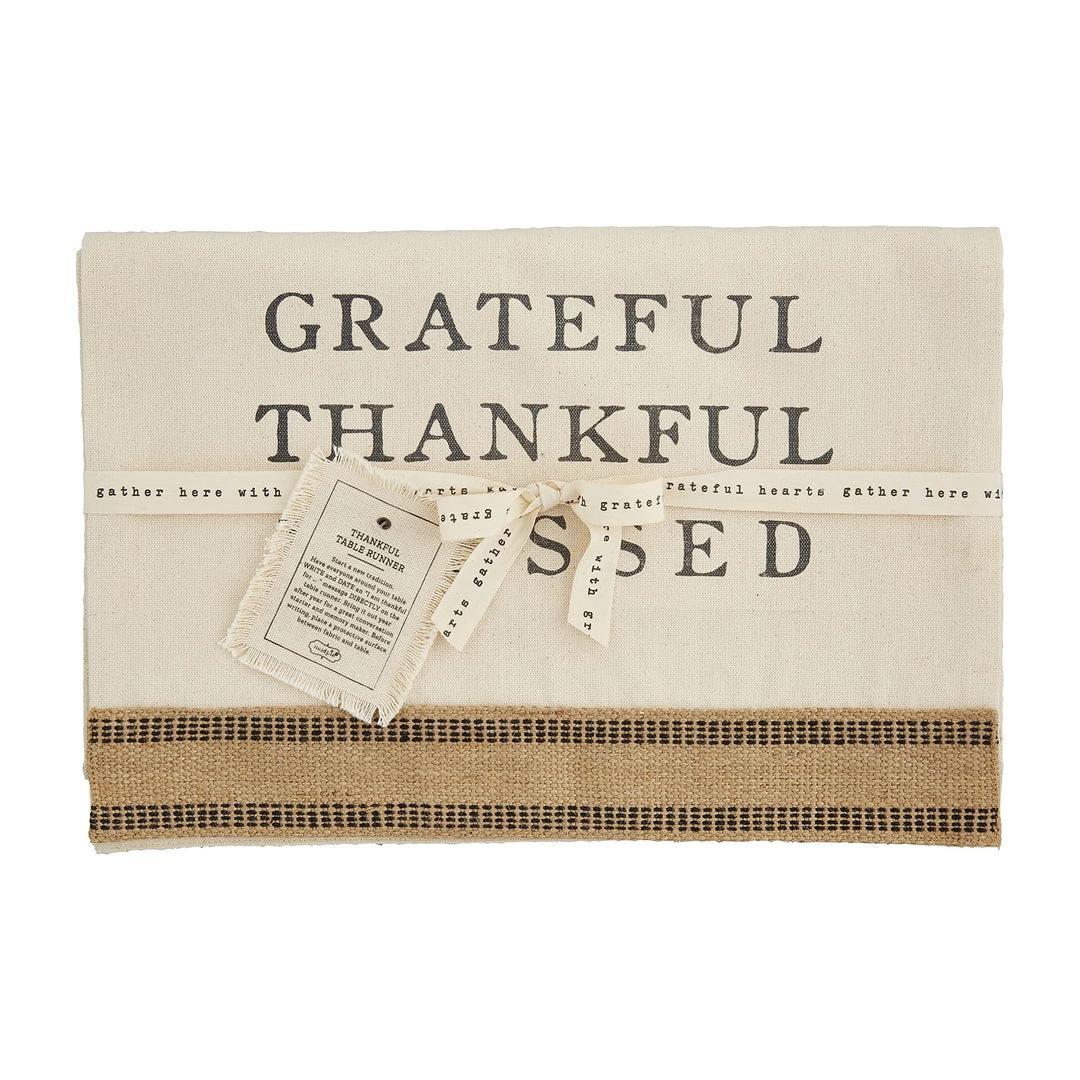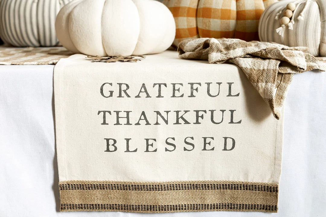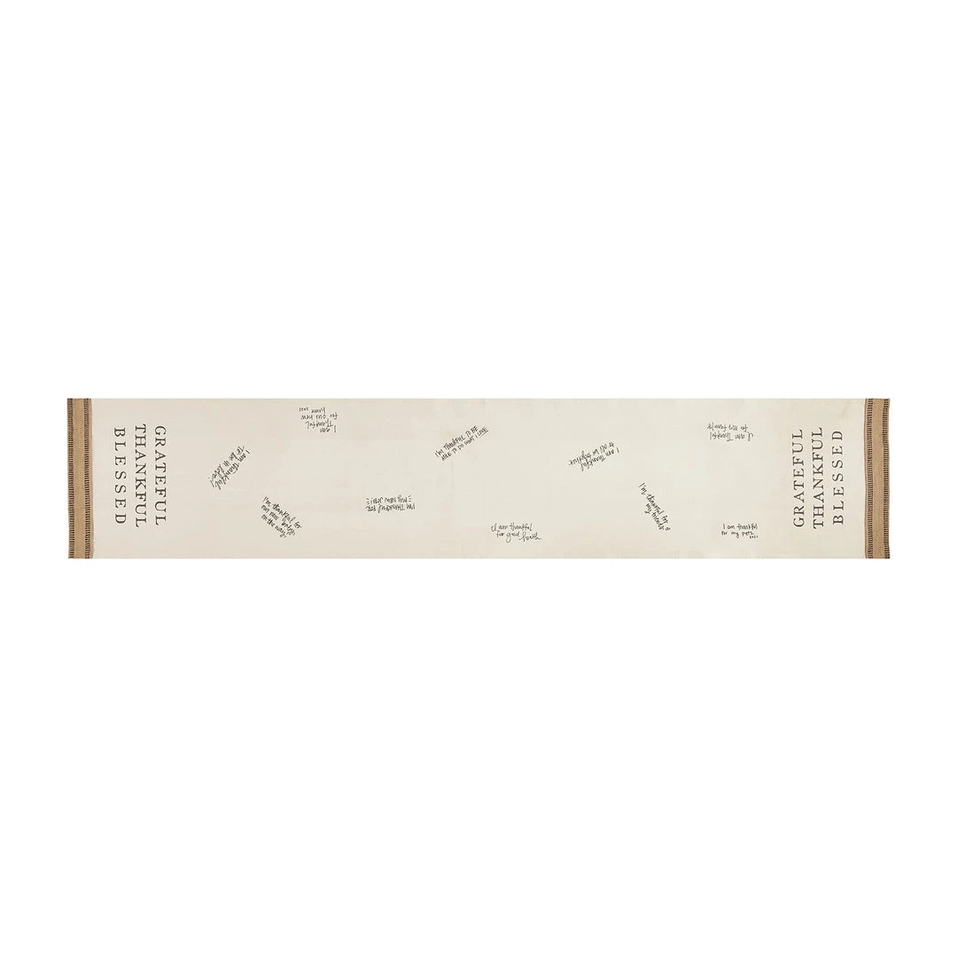 Canvas table runner with jute webbing trim. Have guests write and date what they’re thankful for and use year after year.
