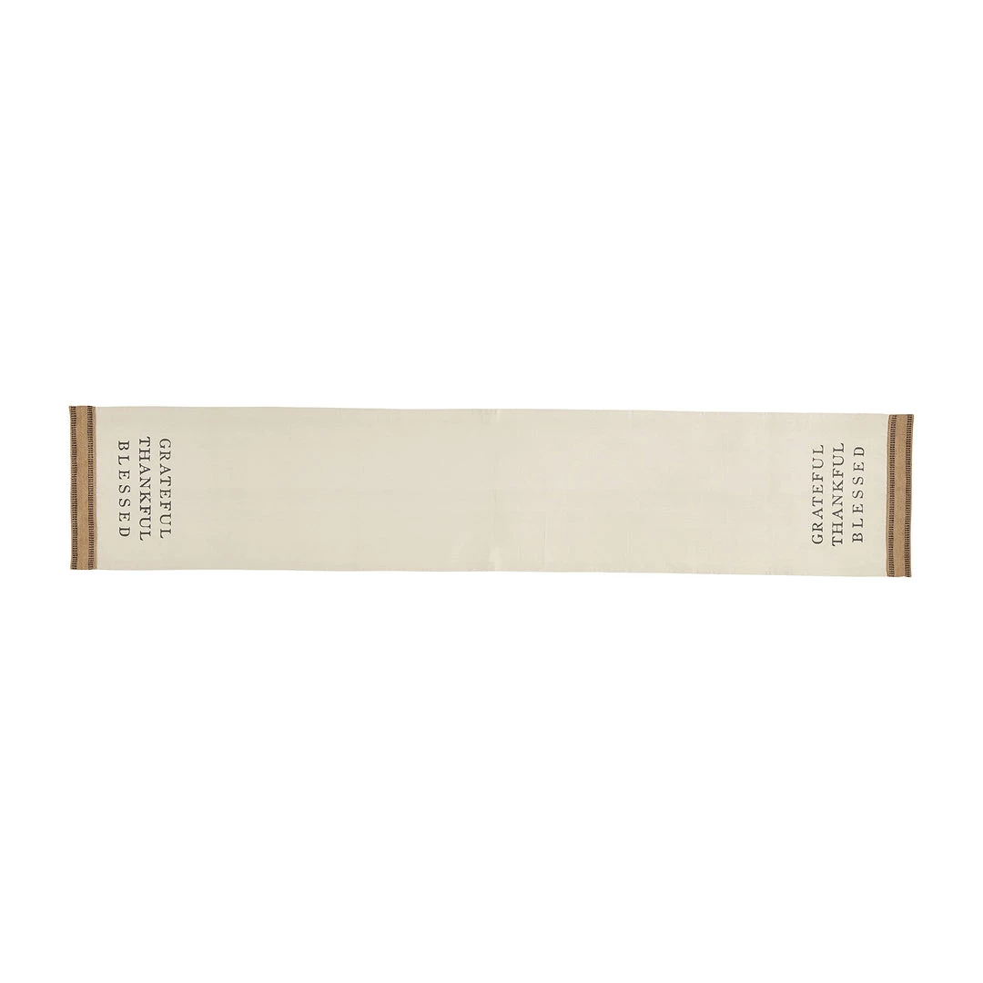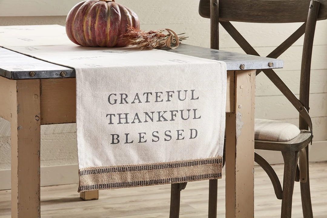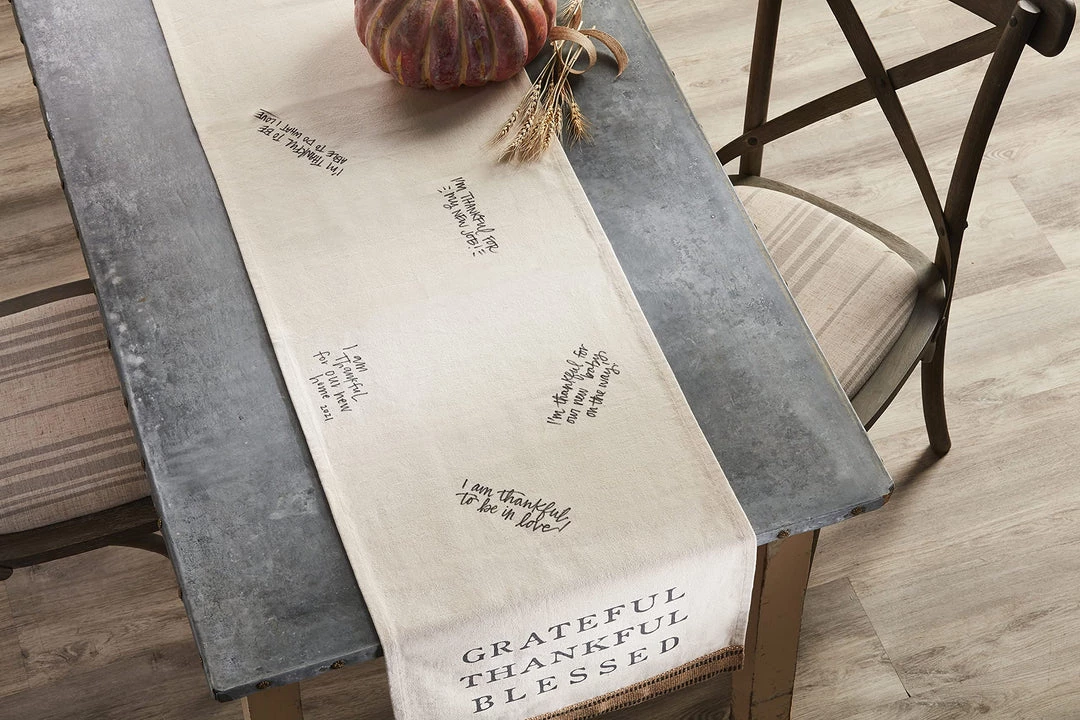 - Canvas table runner with jute webbing trim. Have guests write and date what they’re thankful for and use year after year.