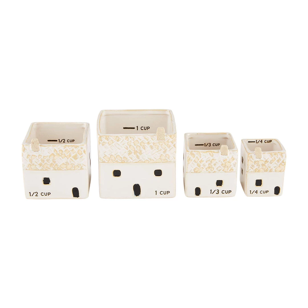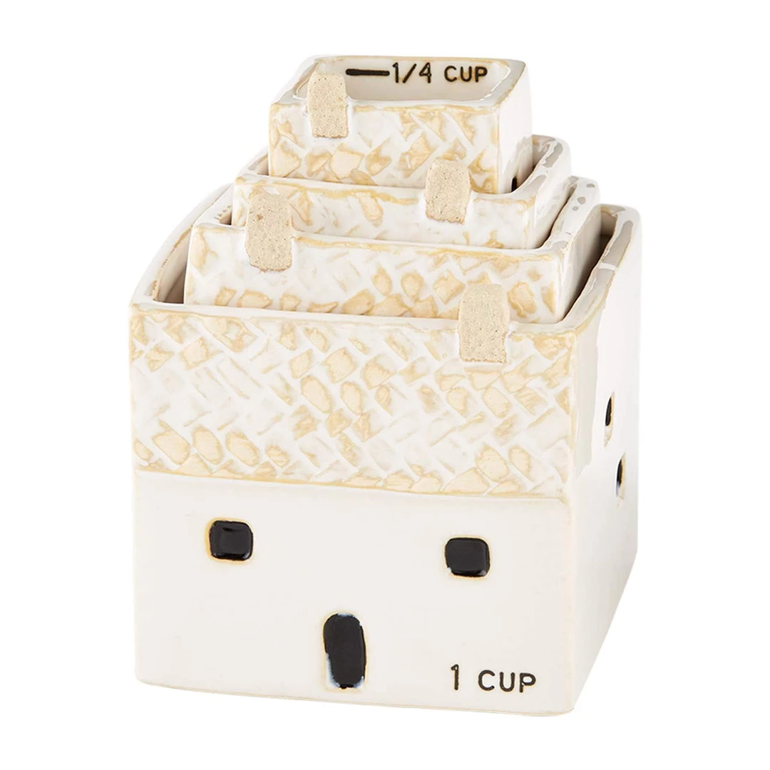 - You’re sure to love our functional and detailed house measuring cup set. The stoneware set comes with four pieces, including measuring cups for 1 cup, 1/2 cup, 1/3 cup and 1/4 cup. Each measuring cup features carved house details like doors and windows. The smaller cups nest into the 1 cup for easy storage.