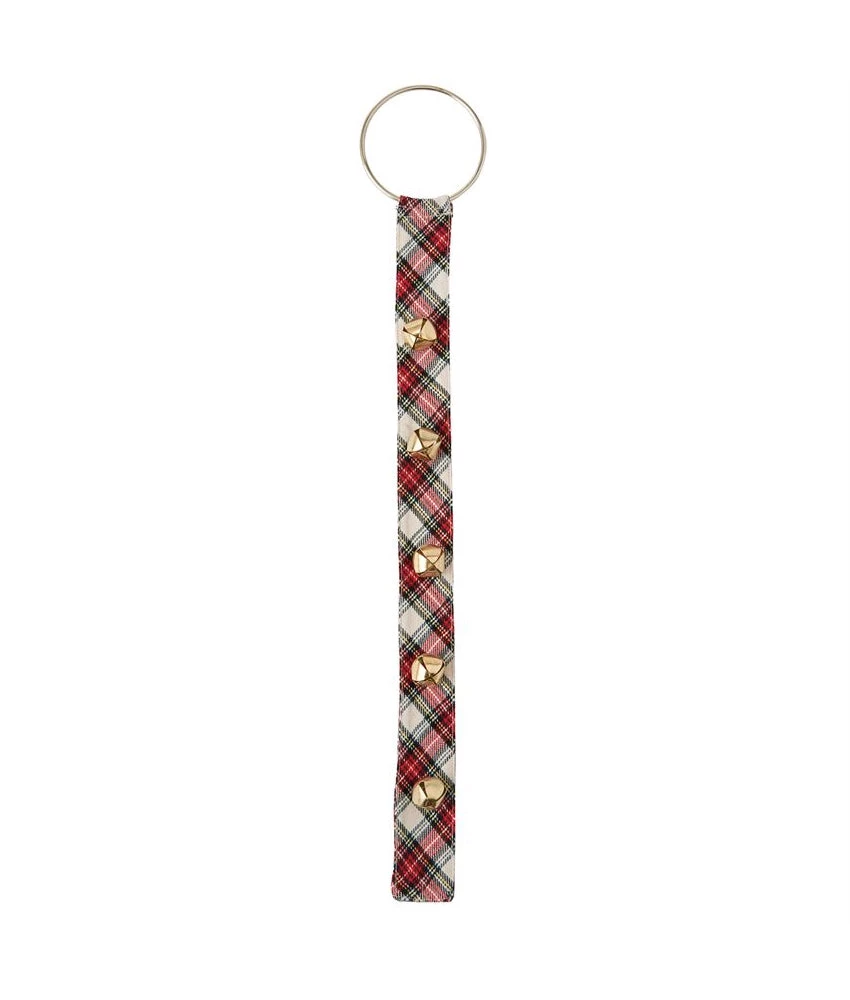 Tartan cotton doggie doorbell features attached gold jingle bells and metal hanging loop.