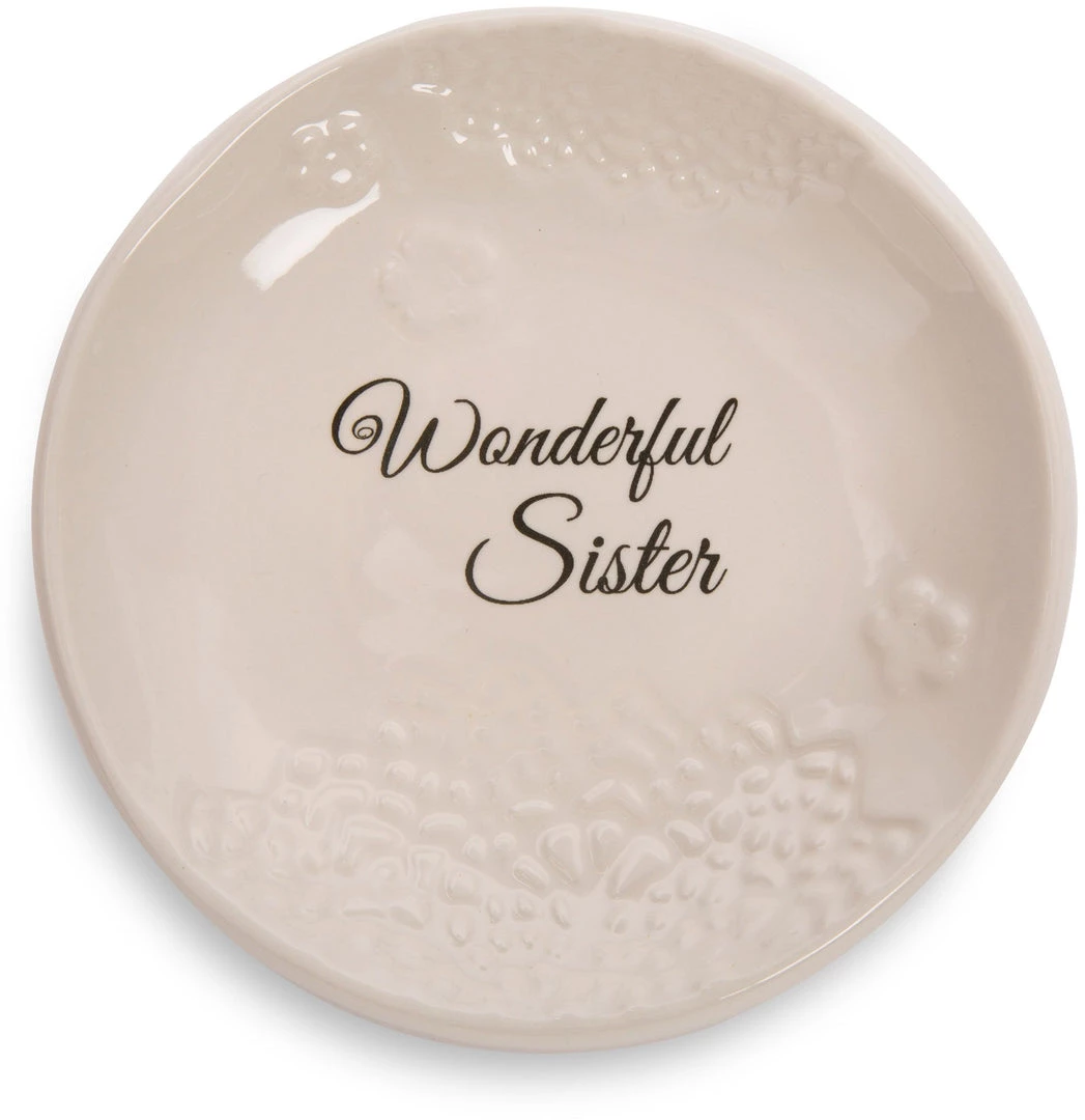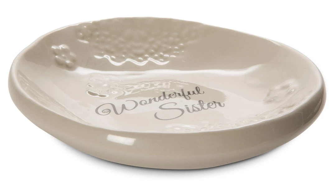 - IN-HOUSE DESIGN: “Wonderful Sister” text is printed onto the top of the dish, alongside a raised floral design.
