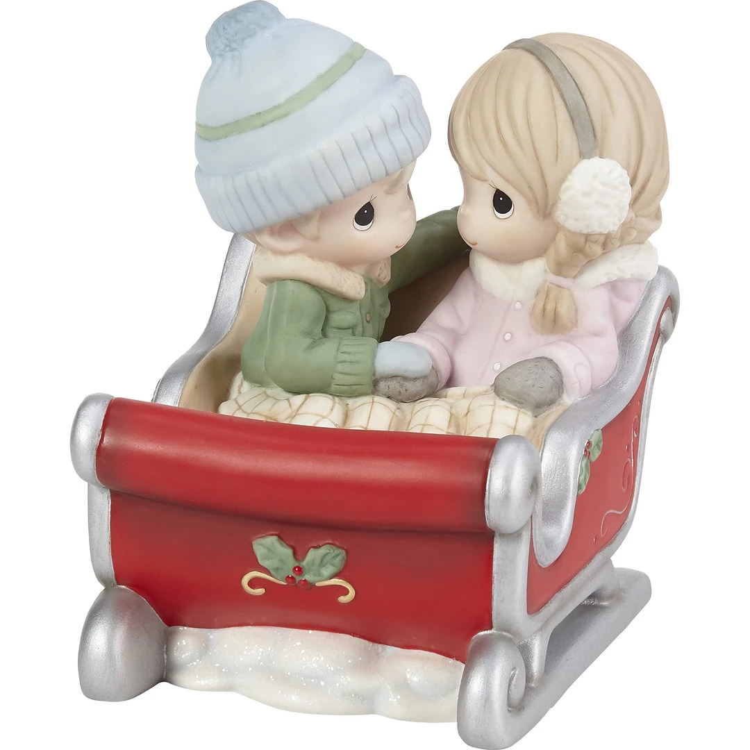 A sweet couple celebrates the season side-by-side in a cozy red holiday sleigh. These two cuties wear their winter coats, mittens, hats, and earmuffs but their love is what really keeps them warm! This figurine is carefully crafted of fine bisque porcelain and is expertly hand-painted.