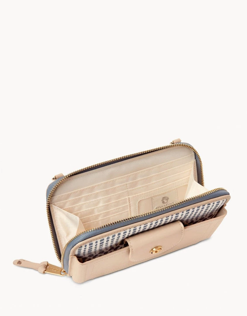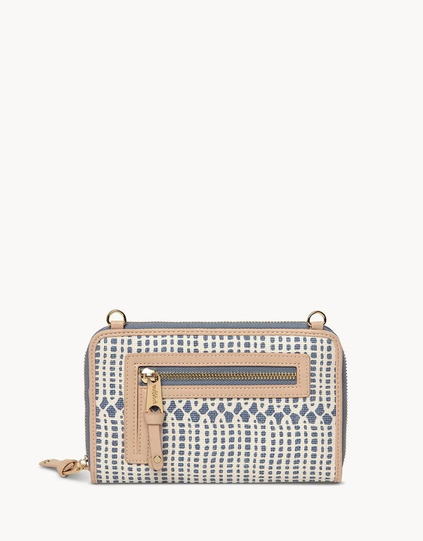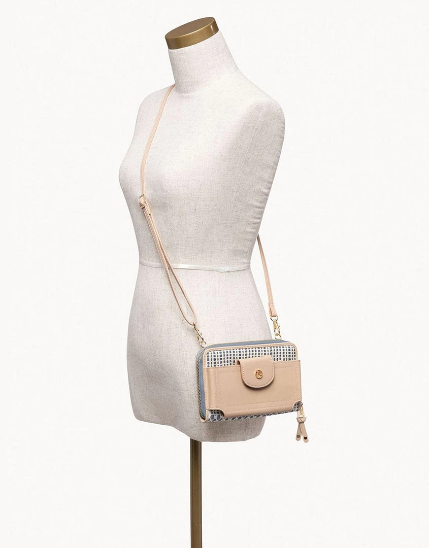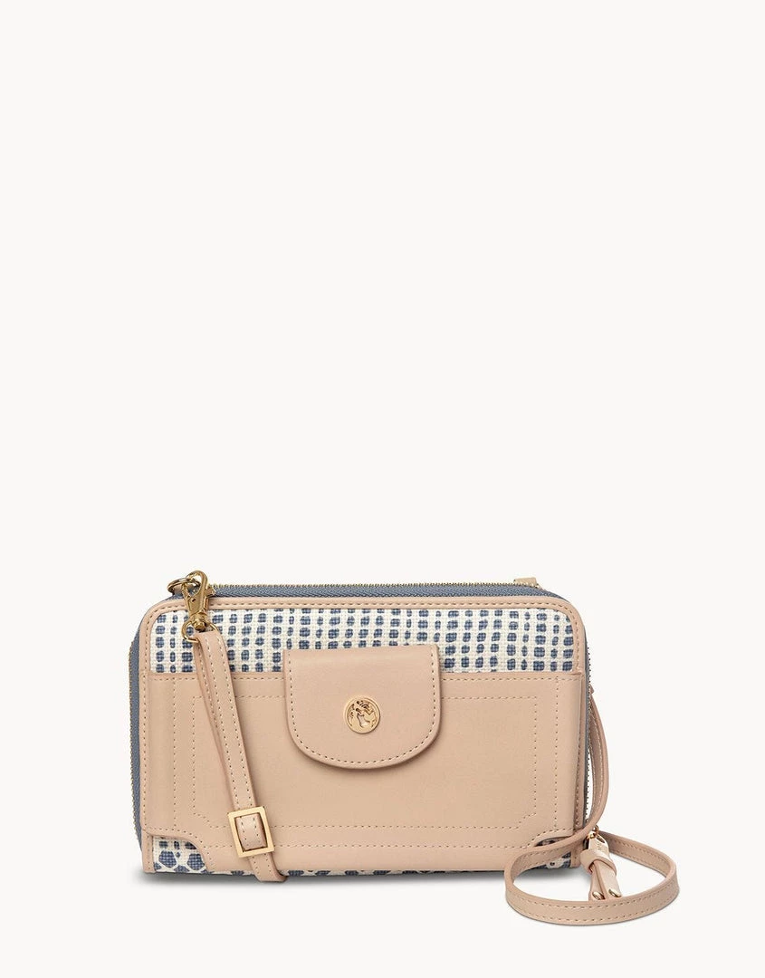- Signature linen with genuine leather accents Adjustable crossbody strap with lobster claw clasps Front pocket with snap closure fits phones up to 3 in. wide and 6 in. long