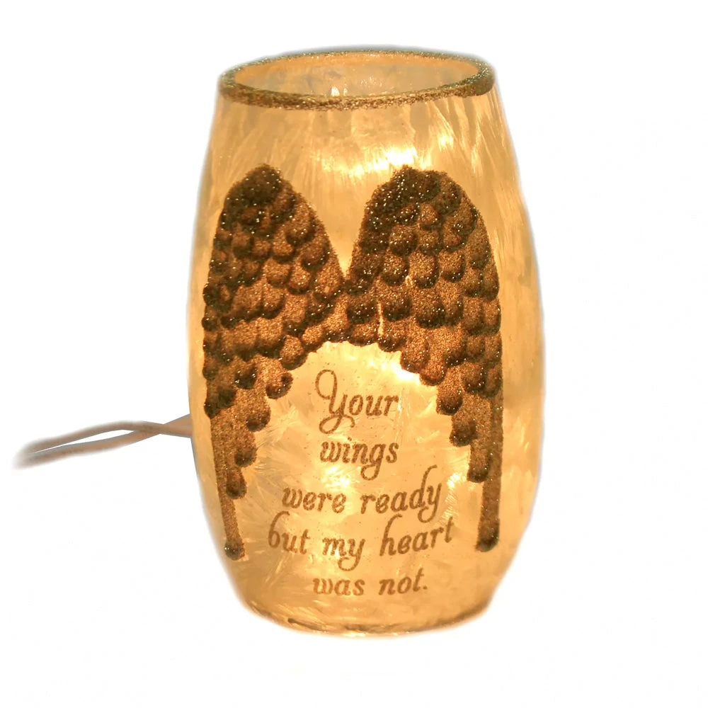 The Gold Frosted Pre-Lit Vase Has Gold Glitter Angel Wings With Message Written Below Them “Your Wings Were Ready But My Heart Was Not”.. New With Box. Frosted Small Pre-Lit Vase Trimmed In Gold Glitter And Message. Add “pop” to any room with these lighted glass art pieces. Each Stony Creek vase is filled with a mini-string of UL-approved white lights that gives off a welcoming, warm soft glow and can be used as a nightlight, table decor or a nice way to decorate for the season. Although Stony Creek identifies their product as a ‘vase’, the item is not intended to hold water. For indoor use only.